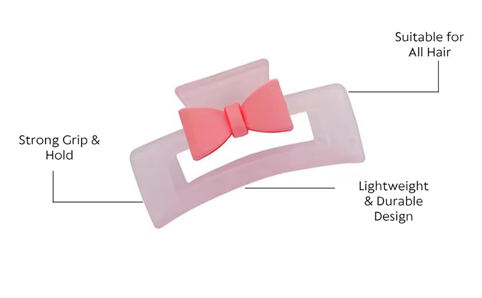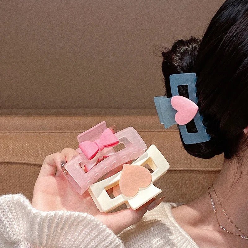 Featuring a modern frosted finish in soothing pastel shades with cute heart & bow accents, this hair claw blends minimal design with playful charm.